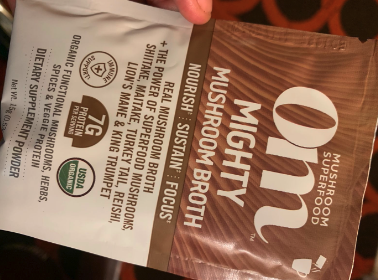 El mushroom brothe de la Marca OM, un polvo a base de hongos y proteína vegana to-go. Esta deli, bueno para viajar y así tener algo de proteína y de honguitos para estar al tiro.
